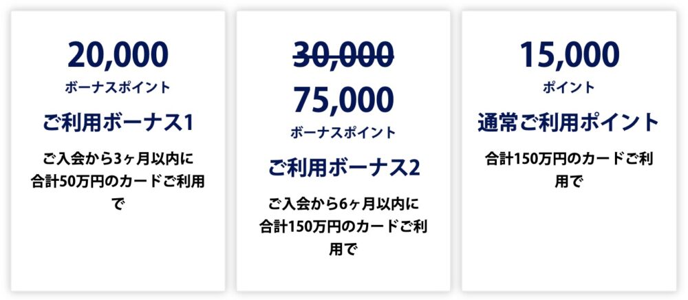 入会後3ヶ月以内に一定金額の利用で段階的にボーナスポイントが獲得でき、通常利用ポイントと合わせて大量ポイントの獲得が可能です。