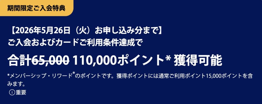 現在開催中の最大110,000ポイントがもらえるキャンペーンの期間は2026年3月18日(水)~ 2026年5月26日(火)となっております。
