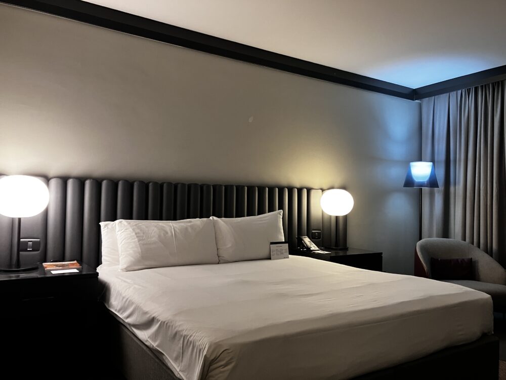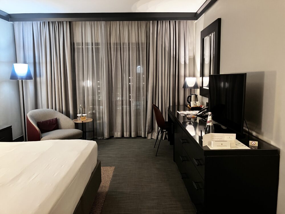 宿泊したのは、35㎡の「クラシックルーム」。インターコンチネンタル マルタの標準的なお部屋です。室内インテリアはブラック&グレーで統一されたモダンなしつらい。