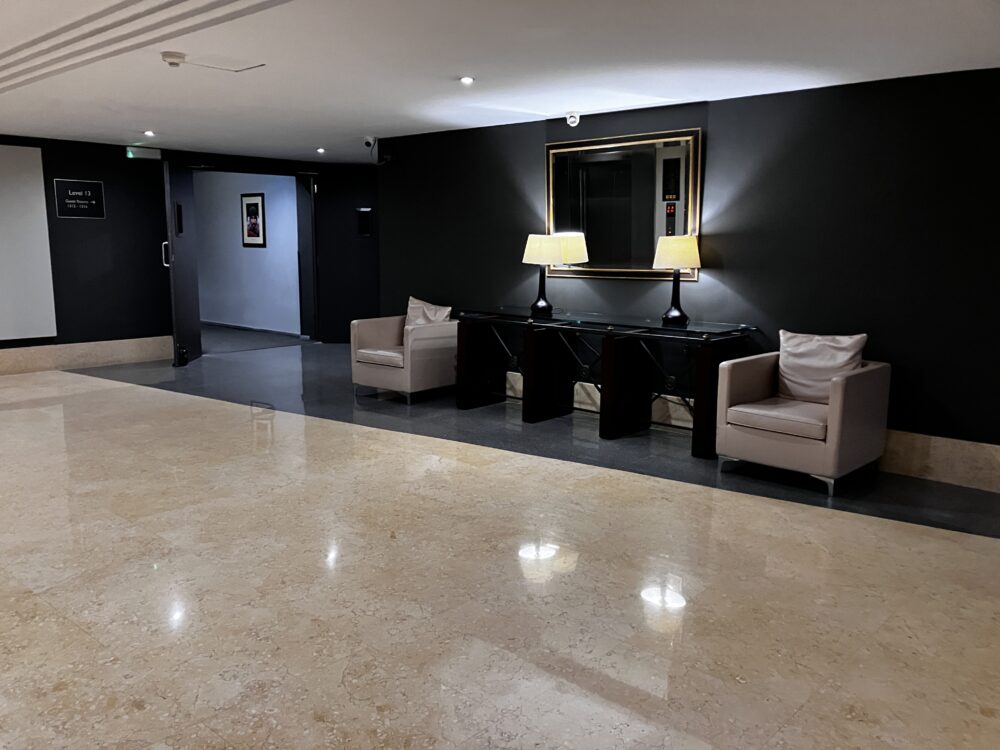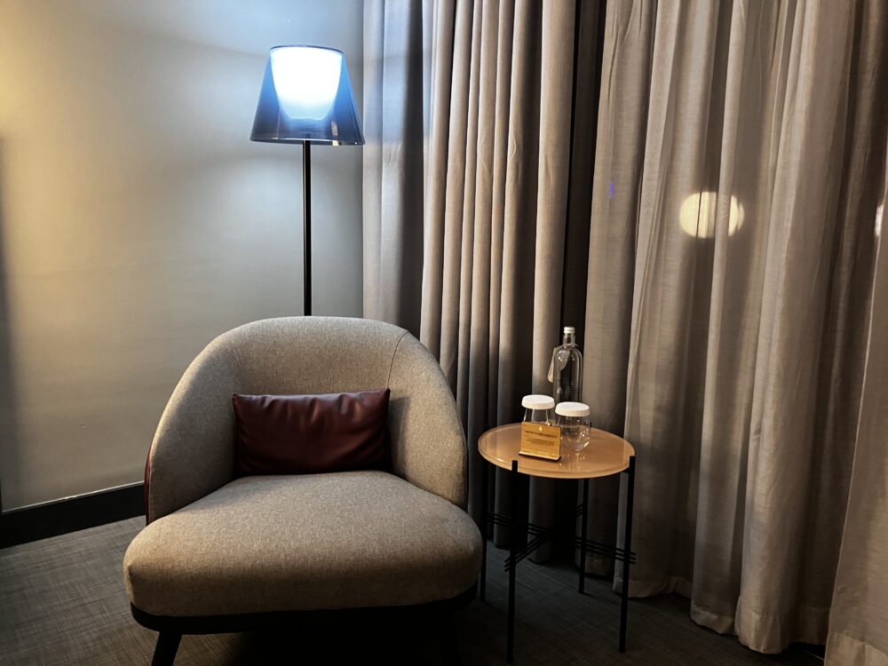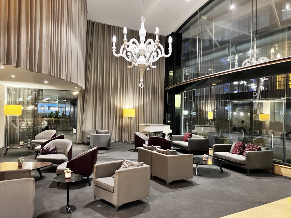 ホテルロビーも、レセプションも、やはり規模に対してコンパクトな印象です。ロビーのソファは、時間帯によっては一掃されていることもあり、企画や団体の動向に応じて柔軟に変わるスペースのようでした。