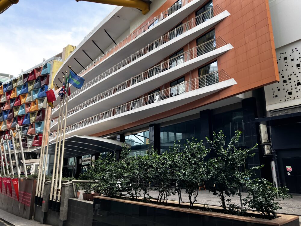 ホテルの表玄関は、比較的カジュアルでコンパクト。面する道路は意外にも片道1車線です。外観では、客室の多さや施設の充実ぶりはうかがい知れません。