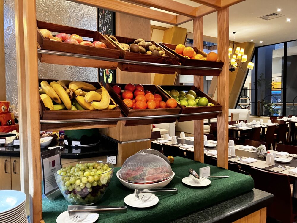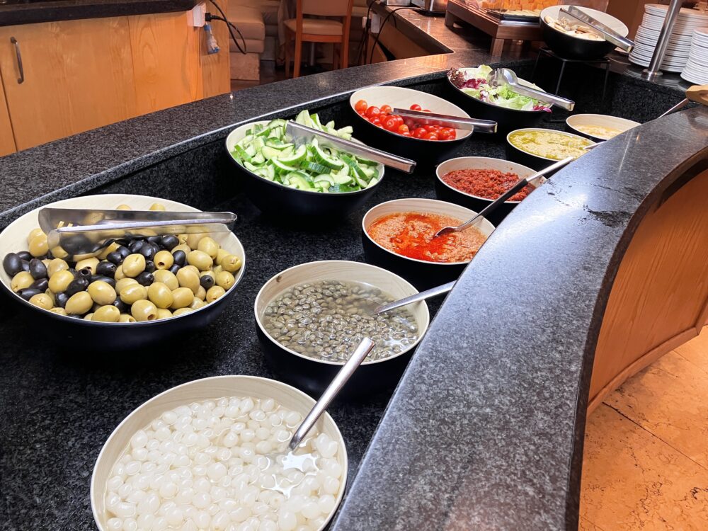 まるで市場のように丸ごとの果物が並べられているのは圧巻。これとは別にふんだんなカットフルーツも用意されています。まだ3月だというのに、ぶどうをはじめ、スイカやメロンまでが毎日提供されていて、学校で習った「地中海性気候」とはこういうことか、と実感。