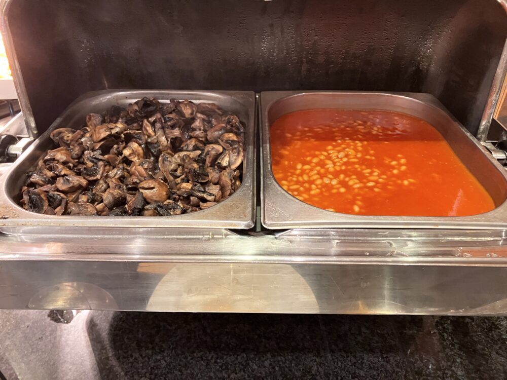 ホットフードには、カリカリの細いショルダーベーコンに加えてハムタイプの肉厚ベーコンもちゃんと用意されていました。ほかにもベイクドビーンズ、炒めマッシュルーム、オーブン焼きトマト、