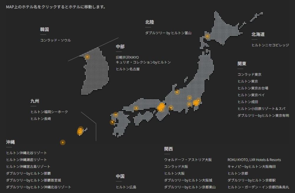 | 中国・四国・九州 | ヒルトン広島、ヒルトン福岡シーホーク、ヒルトン長崎 |