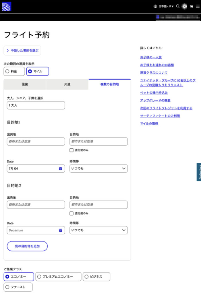 「マイル」を選択して、「複数の目的地」タブに切り替えます。
